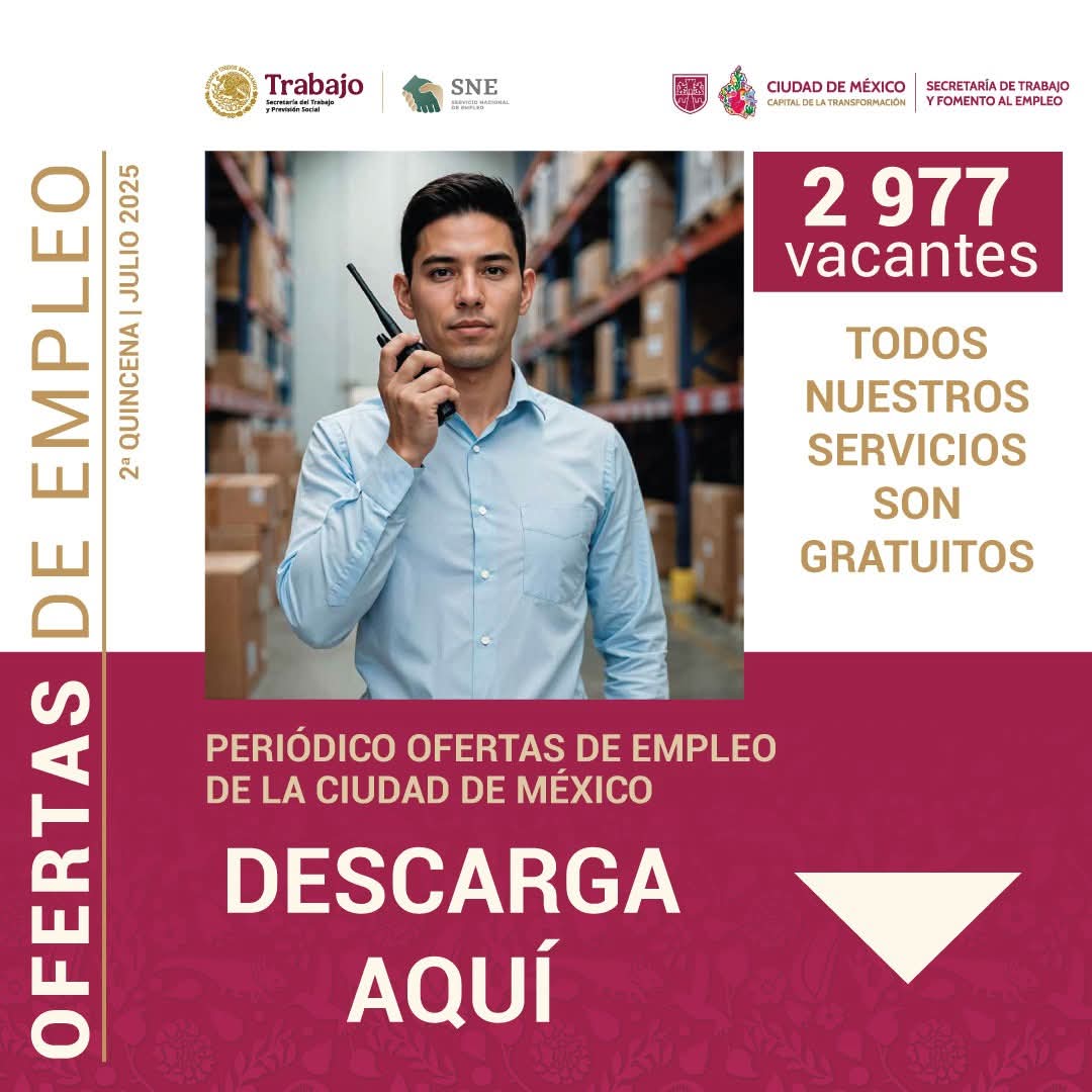 El Periódico Ofertas de Empleo de la Ciudad de México se puede consultar en la siguiente liga: https://trabajo.cdmx.gob.mx/storage/app/media/POE_2A_JULIO_2025.pdf
