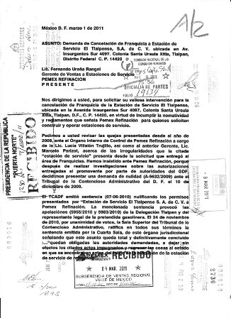 El escrito también fue dirigido al director general de la paraestatal Juan José Suárez Coppel; al Jefe de la Oficina de Presidencia, Gerardo Ruiz Mateos; al titular del área de Quejas de Pemex Refinación, Alfredo rivera Vázquez y al Ombudsman, Raúl Plascencia Villanueva.