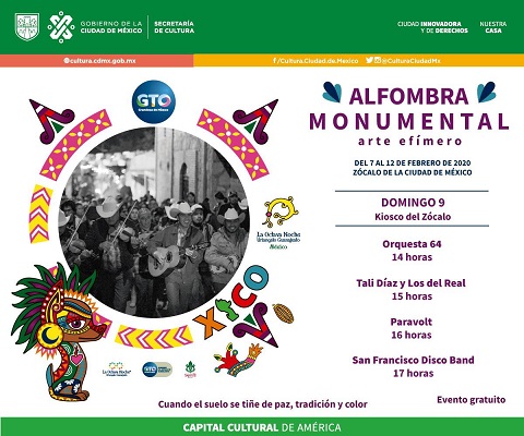 Karaoke dedicado a José Alfredo Jiménez, la participación del niño Luis Ángel Gómez Jaramillo, quien dio voz a uno de los protagonistas de la película animada Coco (2017), huapangos, sones arribeños, danzones, danza folclórica y la tradicional estudiantina, son algunas de las actividades que acompañan la Alfombra monumental. Arte efímero, exhibida del 7 al 12 de febrero en el Zócalo capitalino.